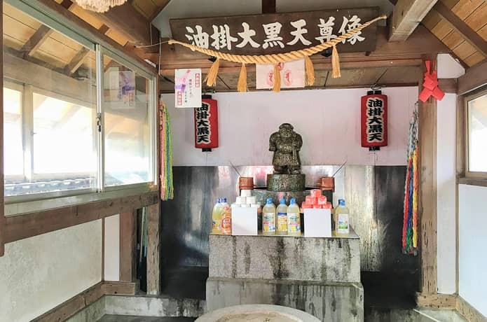 お堂の中には油掛大黒天が祭られており、油を掛けて願掛けをするユニークな参拝方法。