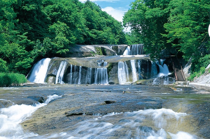 「滑津大滝(なめつおおたき)」は、高さ約10m、幅約30mの豪快な滝で、水量の多いことで知られる名瀑です。