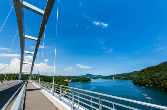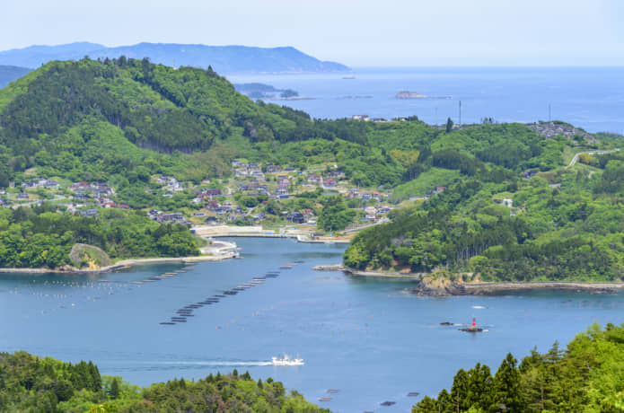 気仙沼湾に浮かび、緑の真珠とも称される気仙沼大島。本土と島の間には気仙沼大島大橋がかかり、車や自転車、徒歩で島へ渡れます。