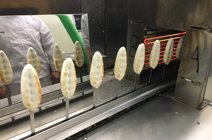 流れる動きはとてもゆっくり。餅のようにプクっと膨らませながら、じっくりと焼き上げていきます。