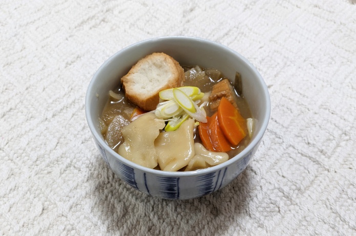 小麦粉に水を加え、耳たぶ程度のかたさになるまでよく練り、指で薄く伸ばして醤油仕立ての汁で煮込んだものです。