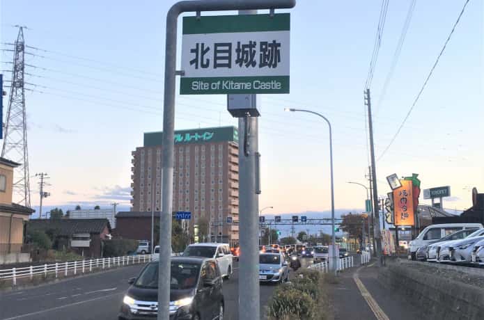 現在は住宅や商業施設が立ち並び、城郭の面影はありません。目印として、写真の標識と説明案内板が設置されています。詳細はぜひ下記記事をみてください!