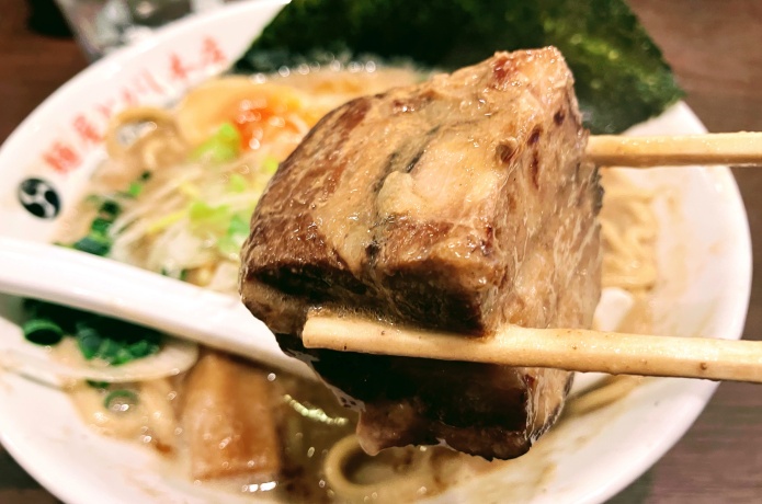 大きくて分厚いチャーシューは迫力満点! 味をつけた状態で丸めて蒸してからタレに漬け込んでいるそうです。柔らかく絶妙な味付けでつくられたチャーシュー。思わずもう1枚追加で食べたくなるような味です。