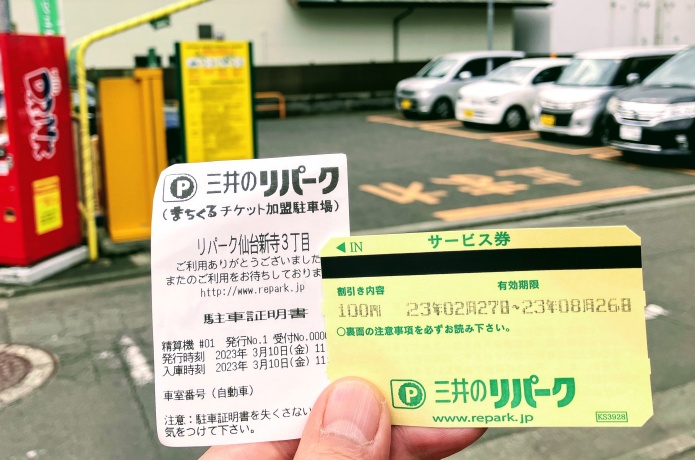 今回筆者は、三井のリパーク仙台新寺三丁目に駐車。精算機の駐車証明書ボタンを押すと駐車証明書が発行されます。この証明書を持ってお店に行き提示すると100円サービス券がもらえます。