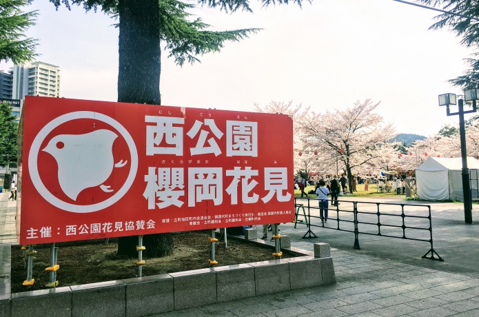 会場前には「西公園 櫻岡花見」と書かれた大きな看板が設置されていました。「櫻岡」は、もともとの名称「桜ヶ岡公園」の名残だと思われます。