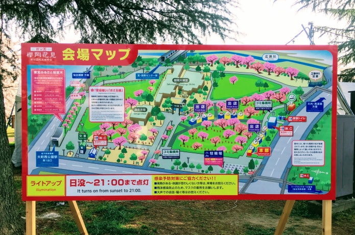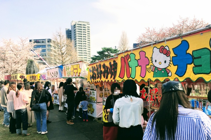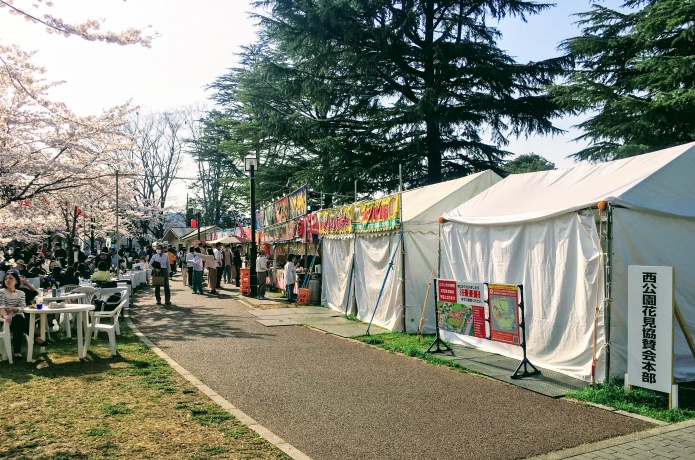 入口には花見本部が設置され、屋台が軒を連ねています。