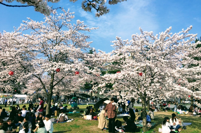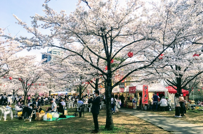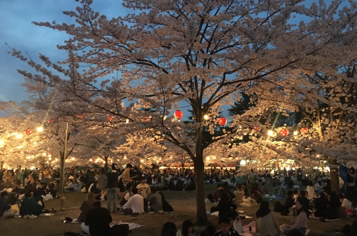 日中の明るい時間から、市民が桜を楽しんでいました。