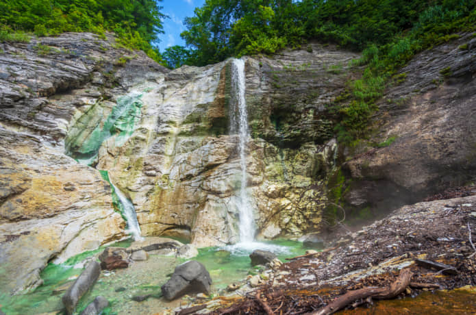 川原毛大湯滝は、全国でも珍しい「温泉の滝」。約1km上流で涌出する温泉が沢水と合流し、20mの高さから流れ落ちています。なんと滝つぼや渓流はすべて天然の露天風呂! 入浴も可能です。