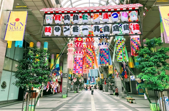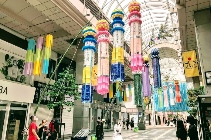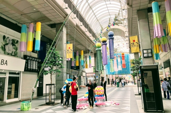 賑やかな提灯飾りが目を引く「サンモール商店街」。鮮やかな七夕飾りが見えてきました。こちらは、ほぼ飾り付けが終わっているようです。