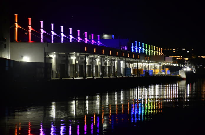 また、橋の手前にある七色に輝く数本の柱は、魚市場新施設C棟・D棟で行われているライトアップによるもの。