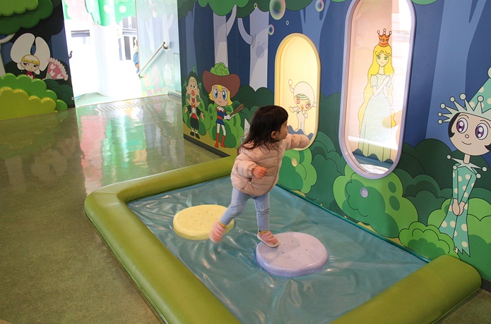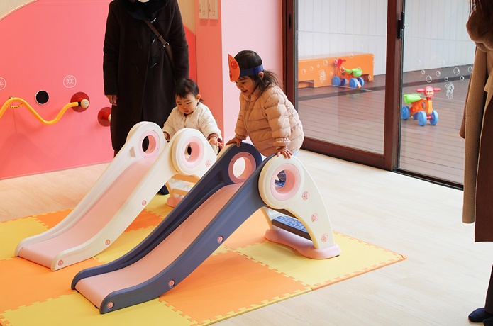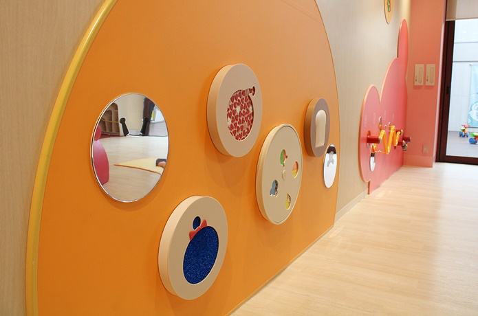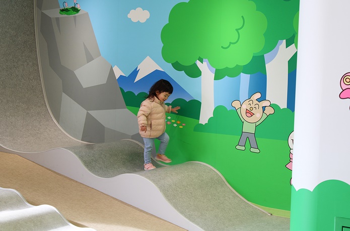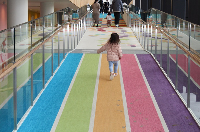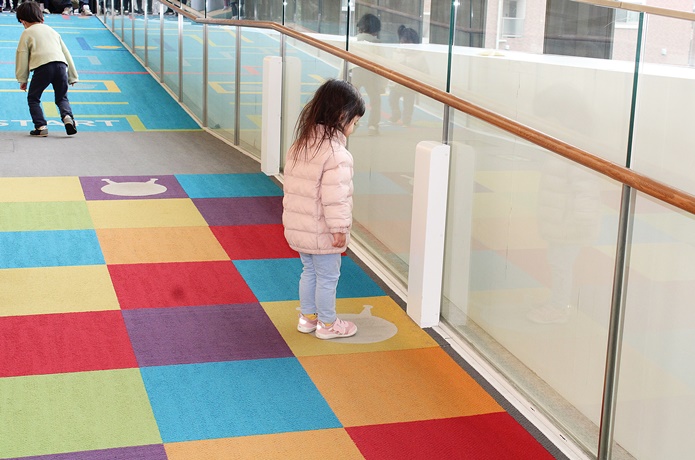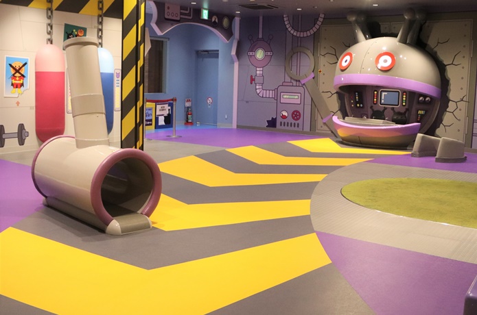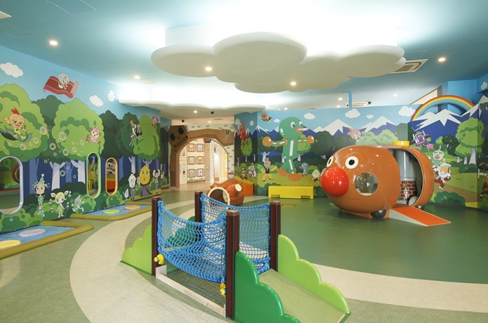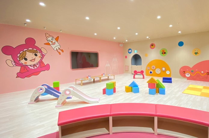 赤ちゃんも体を動かして遊べる「あかちゃんまんテラス」。赤ちゃんがハイハイしても痛くならないよう、床にはクッション性のある素材が使われています。