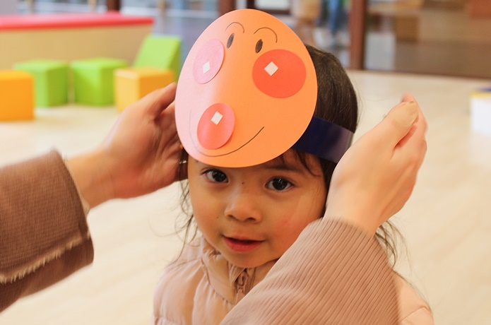 自分で作ったお面は特別。完成したら早速つけて嬉しそうです。お誕生日のおともだちには、お面に王冠をつけてもらえますよ!