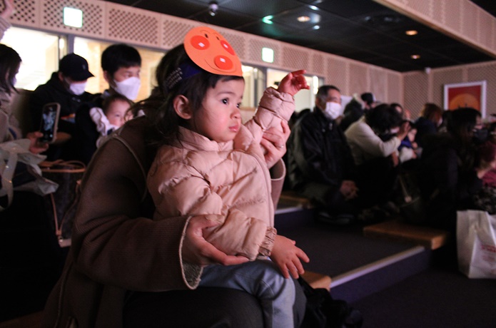 おなじみのテーマソングと元気いっぱいのダンスに子どももノリノリ。音楽に合わせて手拍子で一緒に楽しみます。大好きなアンパンマンとなかまたちを、キラキラした目で真剣に見ていました。