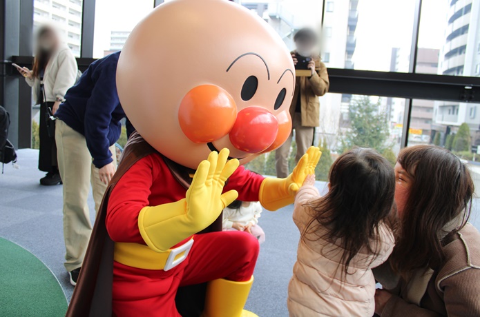 アンパンマンと一緒にハイタッチ! ママやパパは絶好のシャッターチャンスです。子どもとアンパンマンが触れ合う瞬間をカメラに収めましょう。