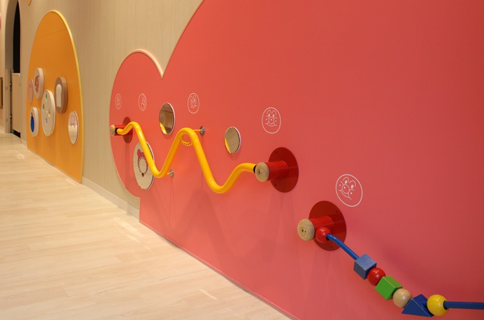 ハイハイやつかまり立ち、小さなすべり台など、赤ちゃんも思いっきり遊べる仕掛けがいっぱい! ハイハイの赤ちゃんも手が届くような高さに設置されており、自分の力でつかんだり、さわったり、回したりして遊べるようになっています。