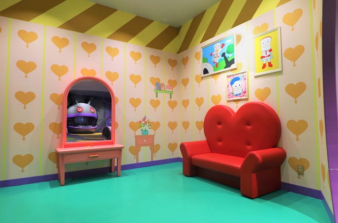 「ドキンちゃんの部屋」には、大好きなしょくぱんまんの写真が飾られています。ハート型のソファに、アニメと同じハート柄の壁紙、ドキンちゃんの個性が現れたキュートな空間です。