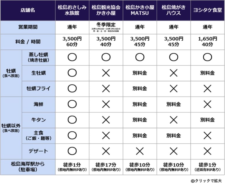 松島の牡蠣食べ放題のおすすめ店舗一覧は以下の通りです。