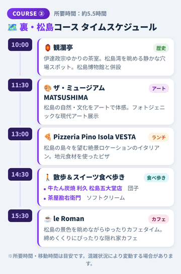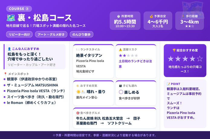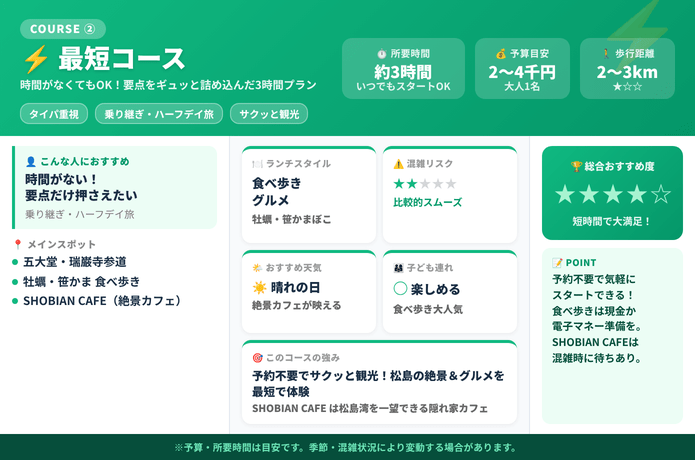 【このコースのポイント】観光客が最も集中するランチタイムを「食べ歩き」に充てることで、待ち時間をゼロにし、3時間という短時間で松島のエッセンスをすべて回収します。