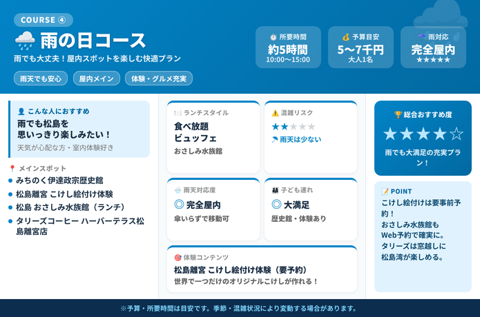 【このコースのポイント】スポット間の移動を最小限に抑え、屋内で楽しめる「体験」と歴史」を凝縮しました。雨に煙る松島湾を窓際から眺める、しっとりとした大人の過ごし方を提案します。