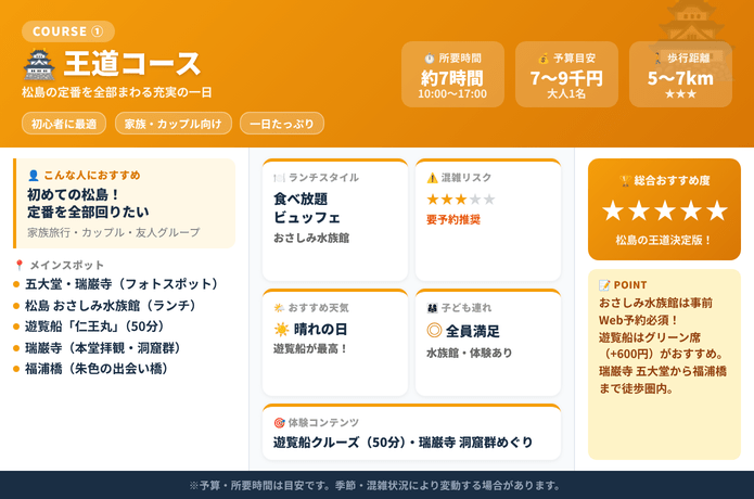 ぜひ、あなたの目的やその日の天気にぴったりのルートを選んで、思い出に残る最高の松島旅を楽しんできてくださいね!