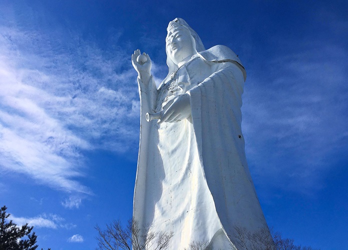 「仙台大観音(せんだいだいかんのん)」の正式名称は、仙台天道白衣大観音(せんだいてんどうびゃくえだいかんのん)。仙台市泉区にある「大観密寺(だいかんみつじ)」の敷地内に立ち、観音像としては日本一の高さを誇ります。